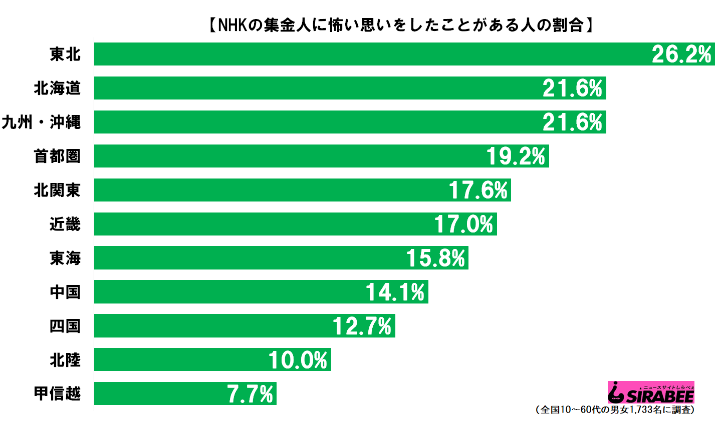 最も割合高かったのは東北で26.2%に。一般的に治安が良い地域が多く、住民も警戒心が薄いといわれる。そんな環境に乗じて、集金人は「怖い」と思われるような行動を取るのかも。